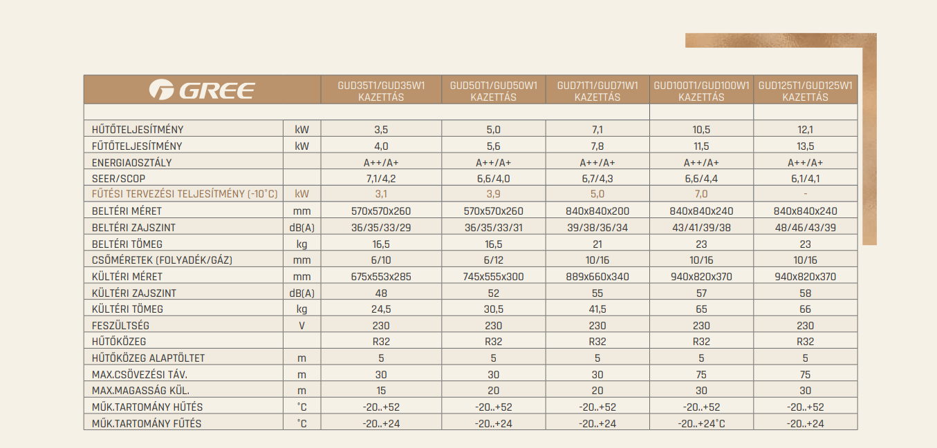 A Gree GUD50T / GUD50W Kazettás Split klíma fontos tulajdonságai:
